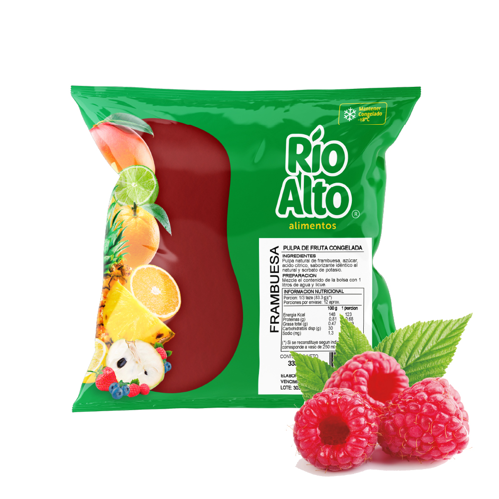 Pulpa Congelada de Fruta sabor Frambuesa en formato de 333 gramos (Caja 5 kilos) Rinde hasta 1 litros de jugo preparado. Hecho con fruta natural