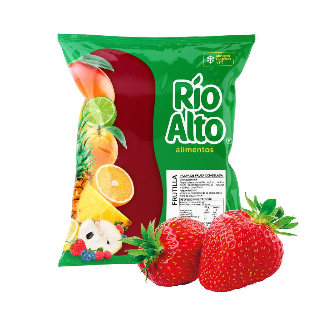 Pulpa Congelada de Fruta sabor Frutilla en formato de 1 Kilo (Caja 5 kilos) Rinde hasta 3 litros de jugo preparado. Hecho con fruta natural