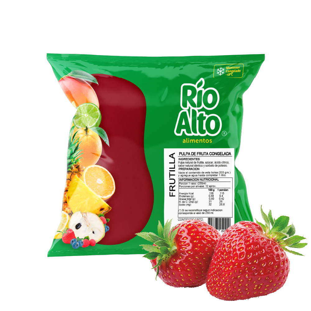Pulpa Congelada de Fruta sabor Frutilla en formato de 333 gramos (Caja 5 kilos) Rinde hasta 1 litros de jugo preparado. Hecho con fruta natural